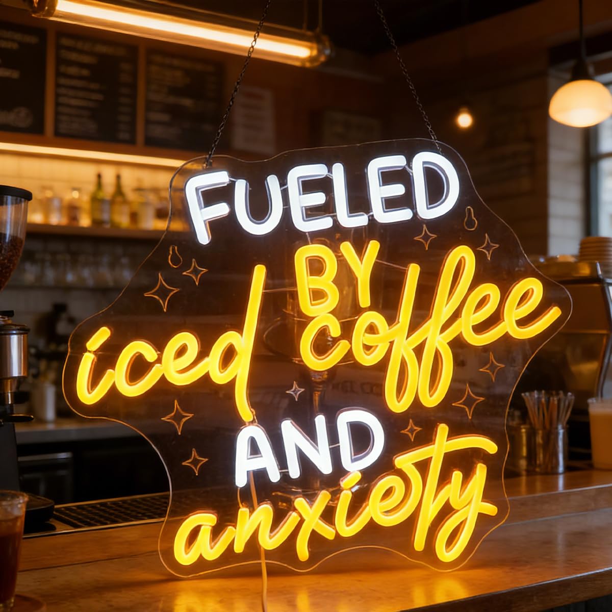 "Fueled by Iced Coffee & Anxiety" LED Wall Light - Witty & Relatable Decor for Home Office, Dorm, Coffee Bar, Dimmable USB, Funny Gift for Hard Workers