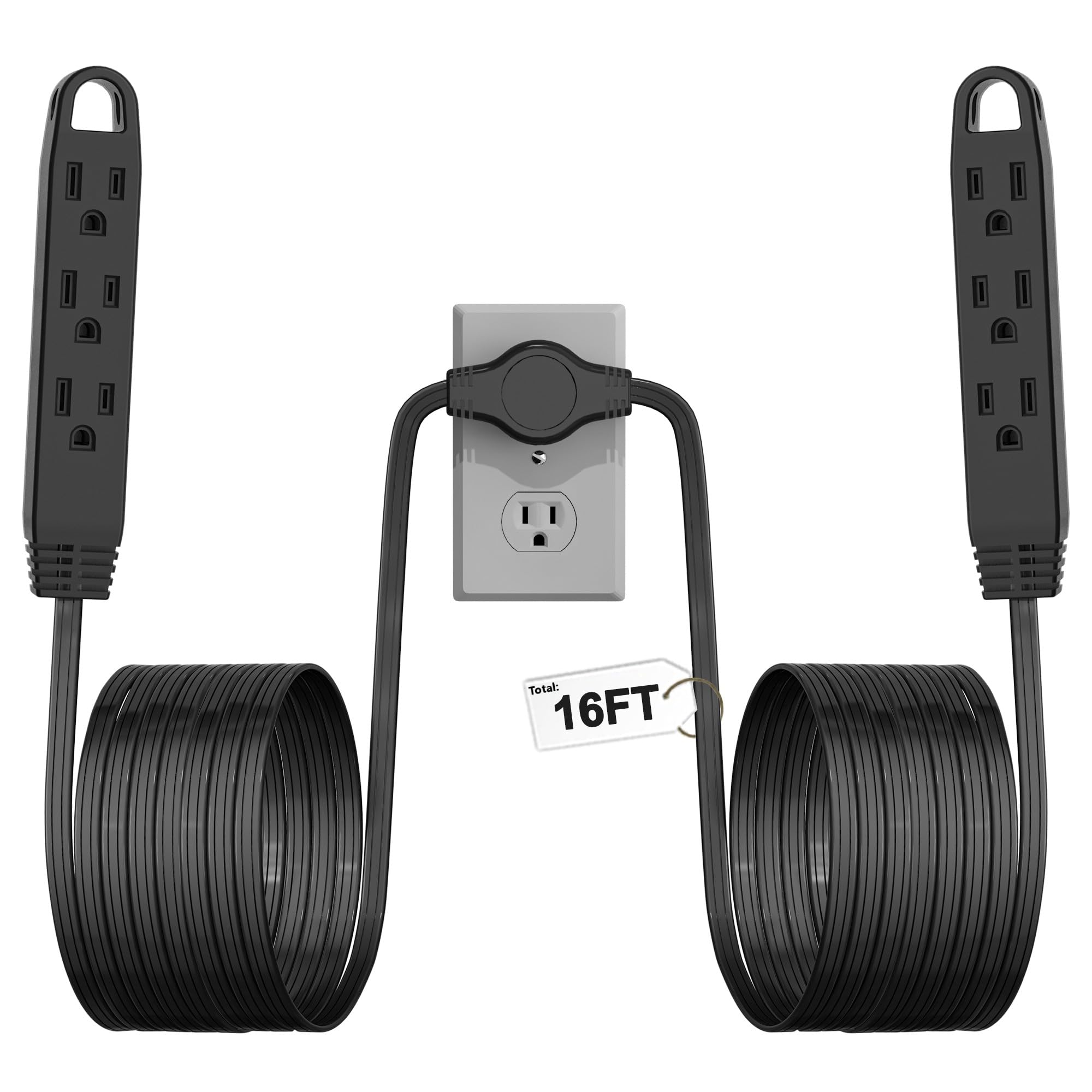 3-Prong 16FT Twin Extension Cord with 6 Outlets - Slim Design for Home Furniture, 16FT Double Cord 8 FT Each Side in Black Color