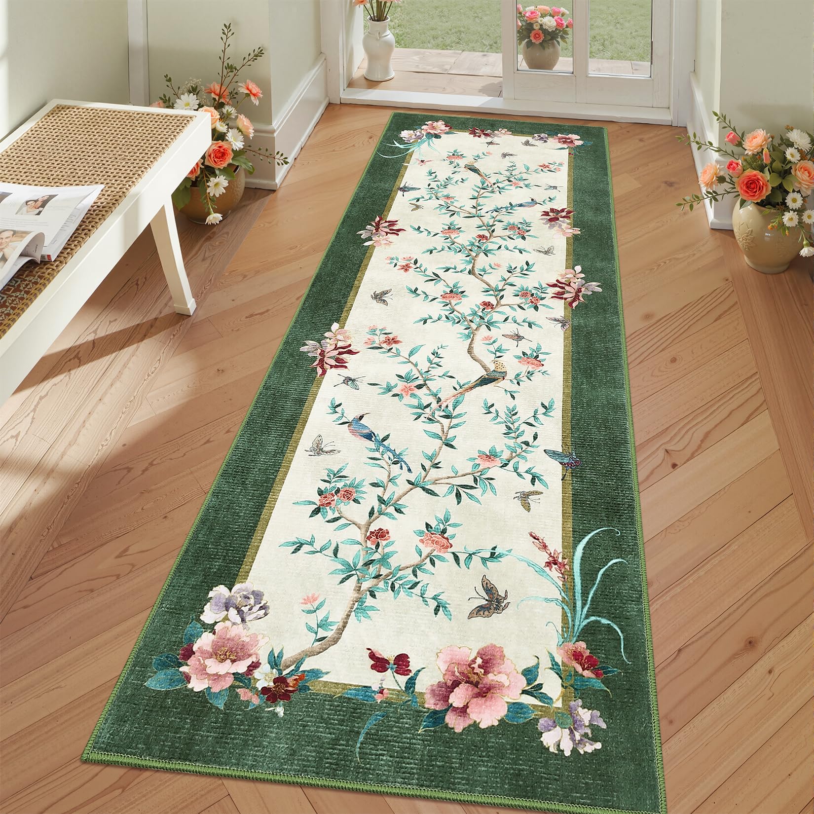 GarveeHome Hallway Runner Rug 2x6 Chinoiserie-Style Kitchen Rugs Oriental Colorful Butterfly Birds Floral Rug for Kids Nursery Dining, Green