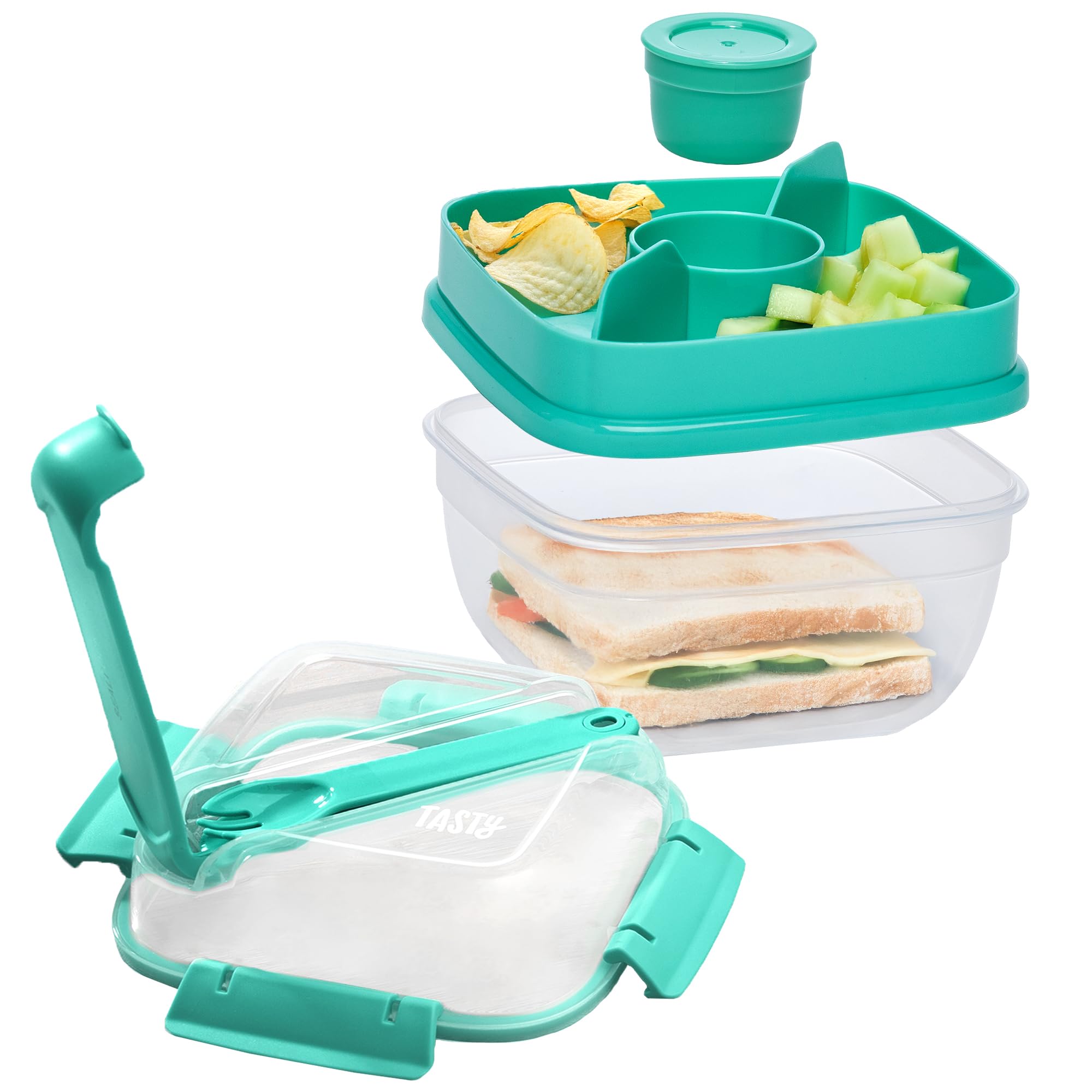 Tasty Stackable Bento Box, 37 oz Base with Removable Toppings Tray & Sauce Cup, Includes Knife & Spork, Easy-Latch Lid, Dishwasher Safe, Aqua