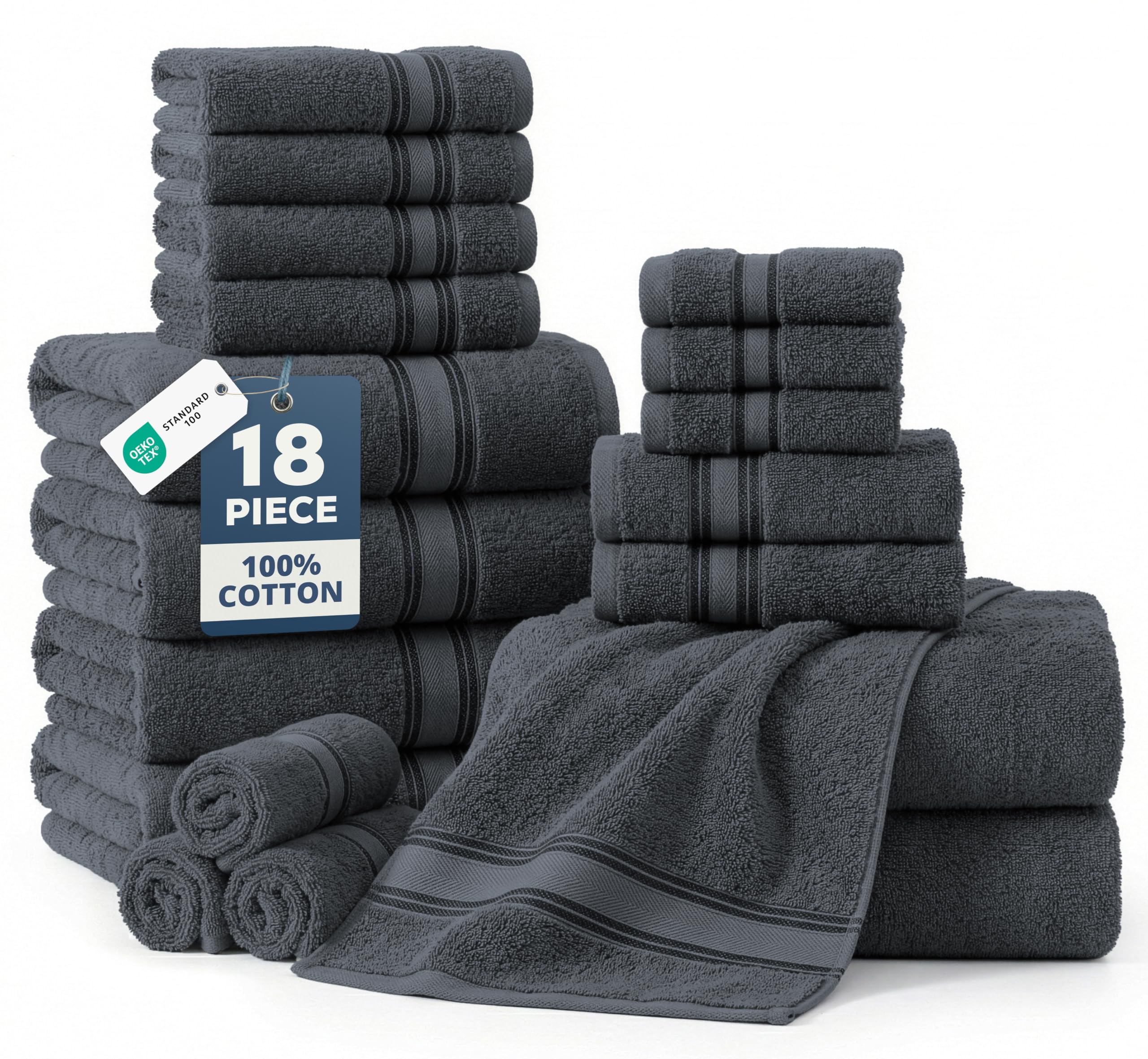 LANE LINEN 100% Mercerized Cotton Bath Towels Set of 18 – Zero Twist, 6 Bath, 6 Hand Towel & 6 Washcloths, Soft, Ideal for Spa Hotel & Home, Gentle on Body, Durable After Multiple Washes – Cool Grey