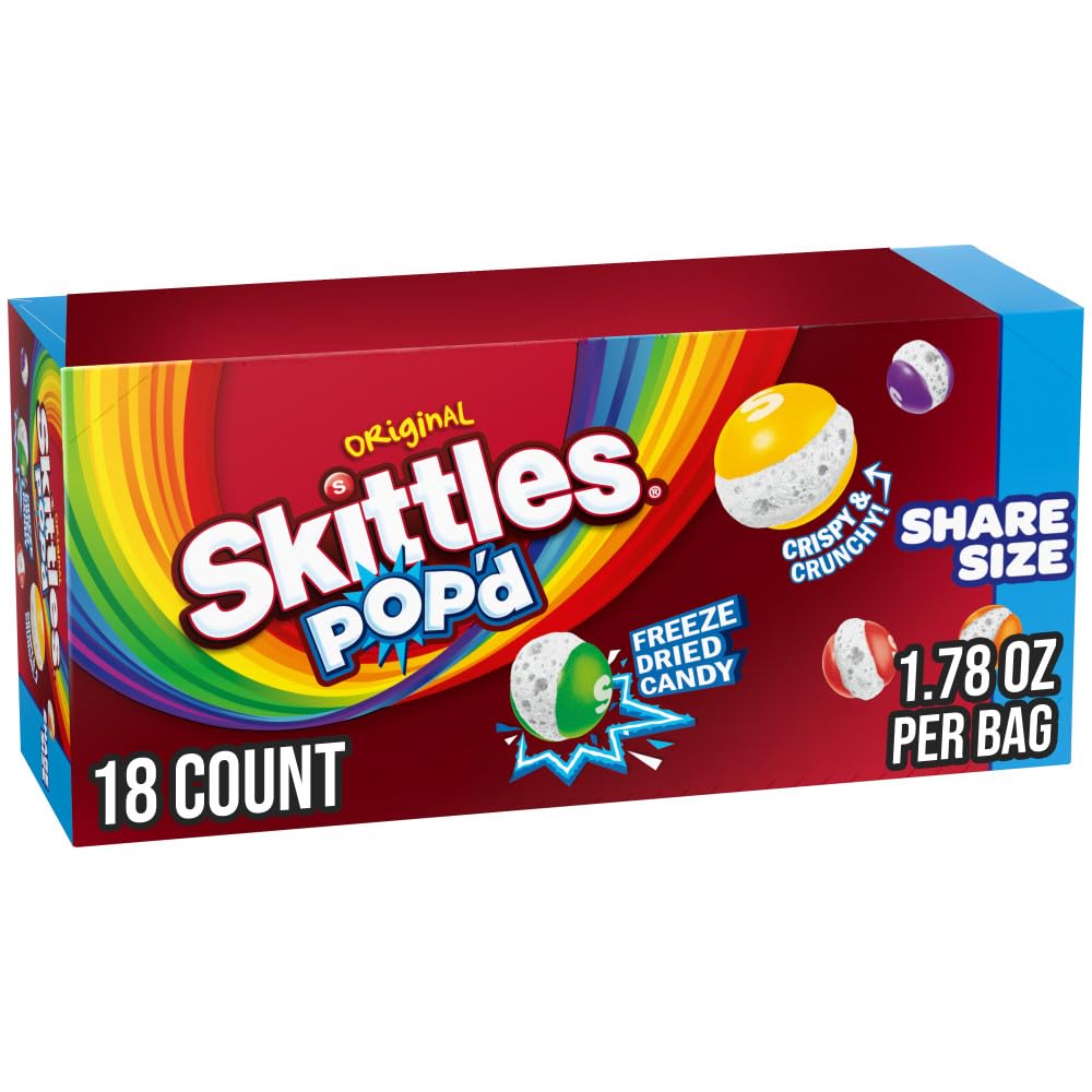 Skittles Pop'd Originals offer a freeze-dried twist on the classic fruity candy, delivering a crunchy texture with the familiar fruit flavors in a convenient share size pack of 18 bags, each 1.78 ounces. This format suits snacking on the go