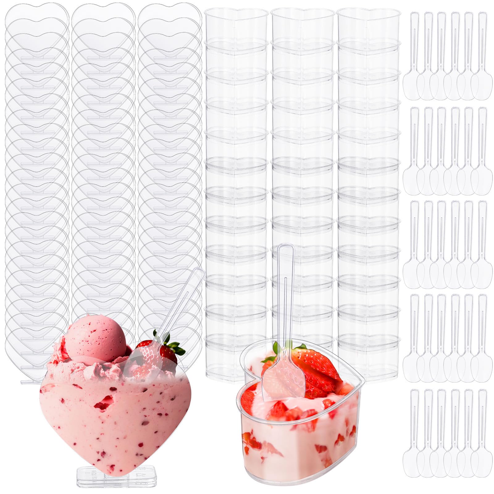 This set includes 160 clear plastic heart-shaped dessert cups in two sizes—80 cups at 5 oz and 80 at 3 oz—each accompanied by a spoon. Made from food-grade plastic, these disposable containers offer a convenient way to serve desserts at any