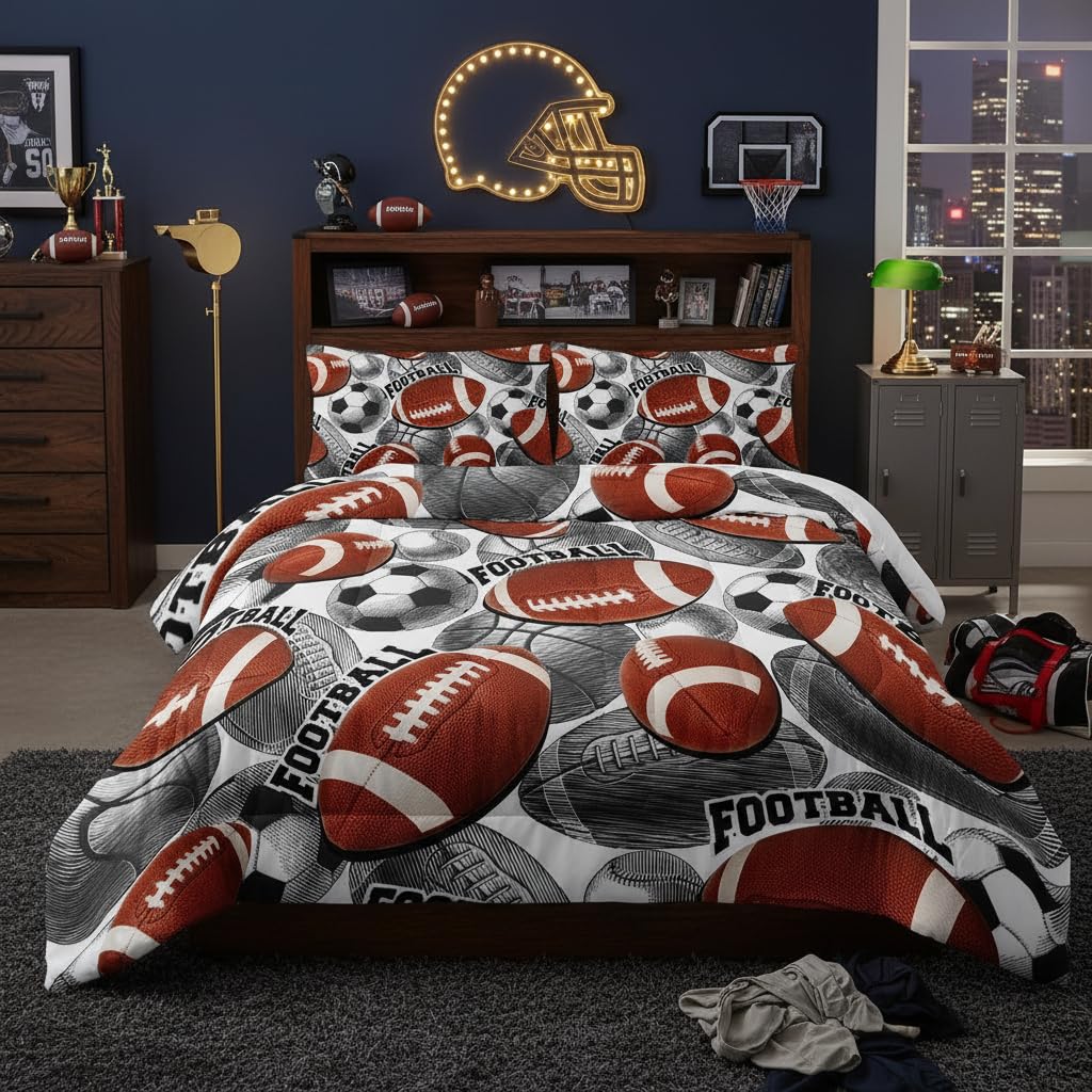 This queen-size comforter set from QOOMO brings a playful sports theme to kids' rooms with basketball and soccer designs in a casual black style. The set includes a comforter and two pillowcases, making it a complete bedding solution for a