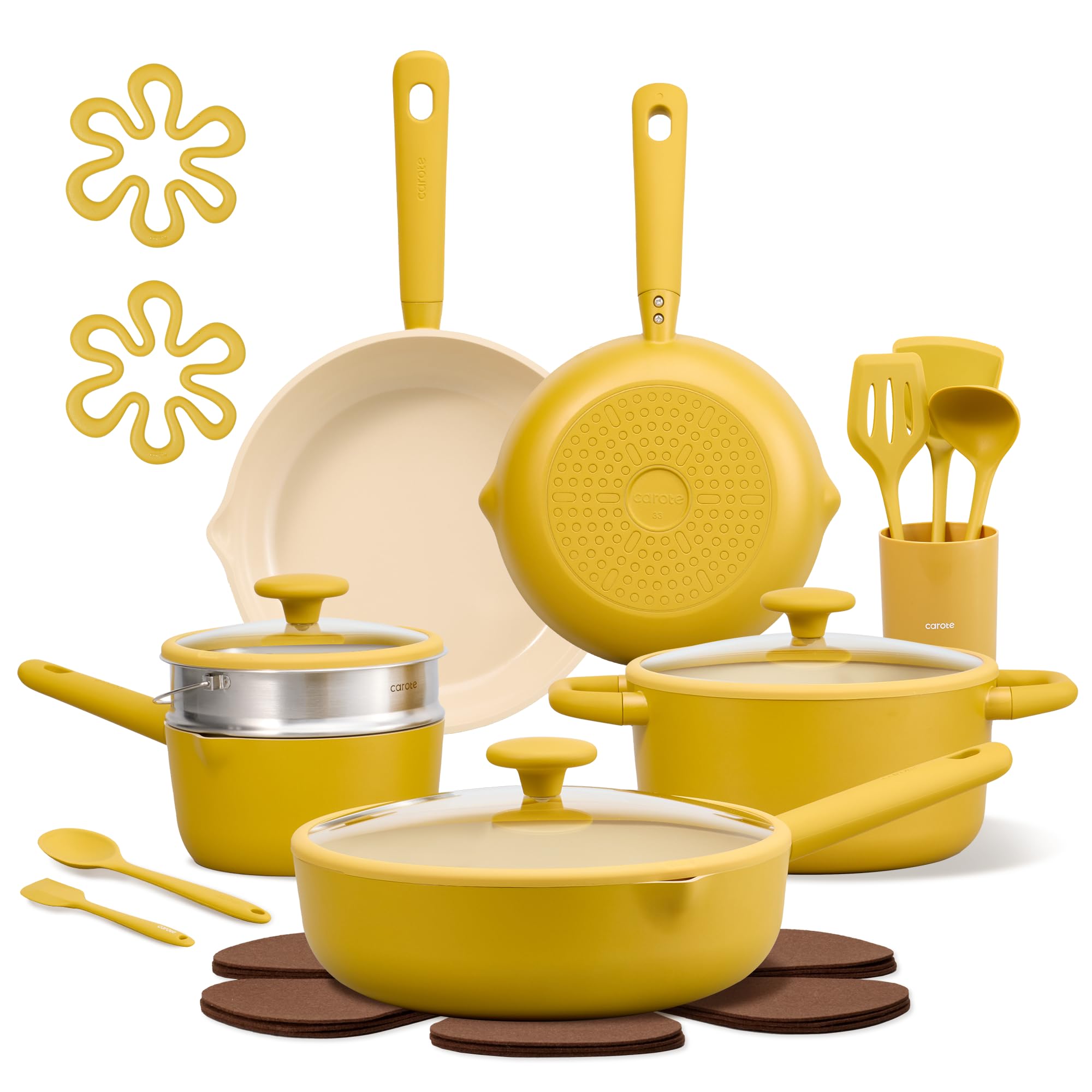 This 21-piece CAROTE cookware set features nonstick ceramic-coated aluminum pots and pans designed for induction cooking. It offers a full range of kitchen essentials in a bright yellow finish, emphasizing a non-toxic, PFAS and PTFE-free,