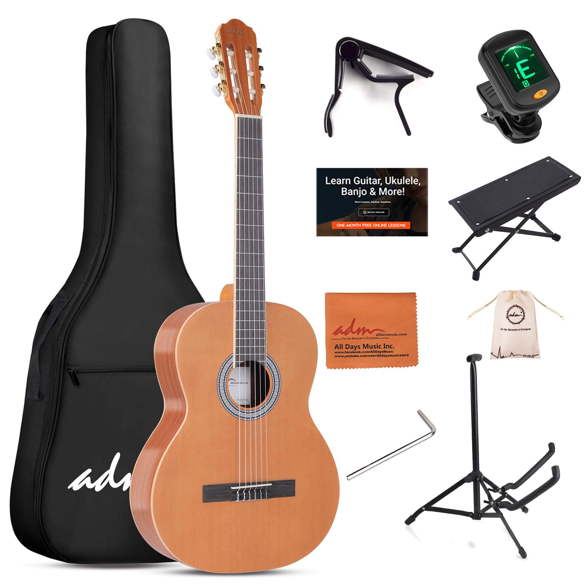 This 39-inch ADM classical acoustic guitar comes with nylon strings and a yellow red pine body, bundled with accessories including free lessons, a gig bag, e-tuner, and footstool. It's designed for adult beginners seeking a complete starter