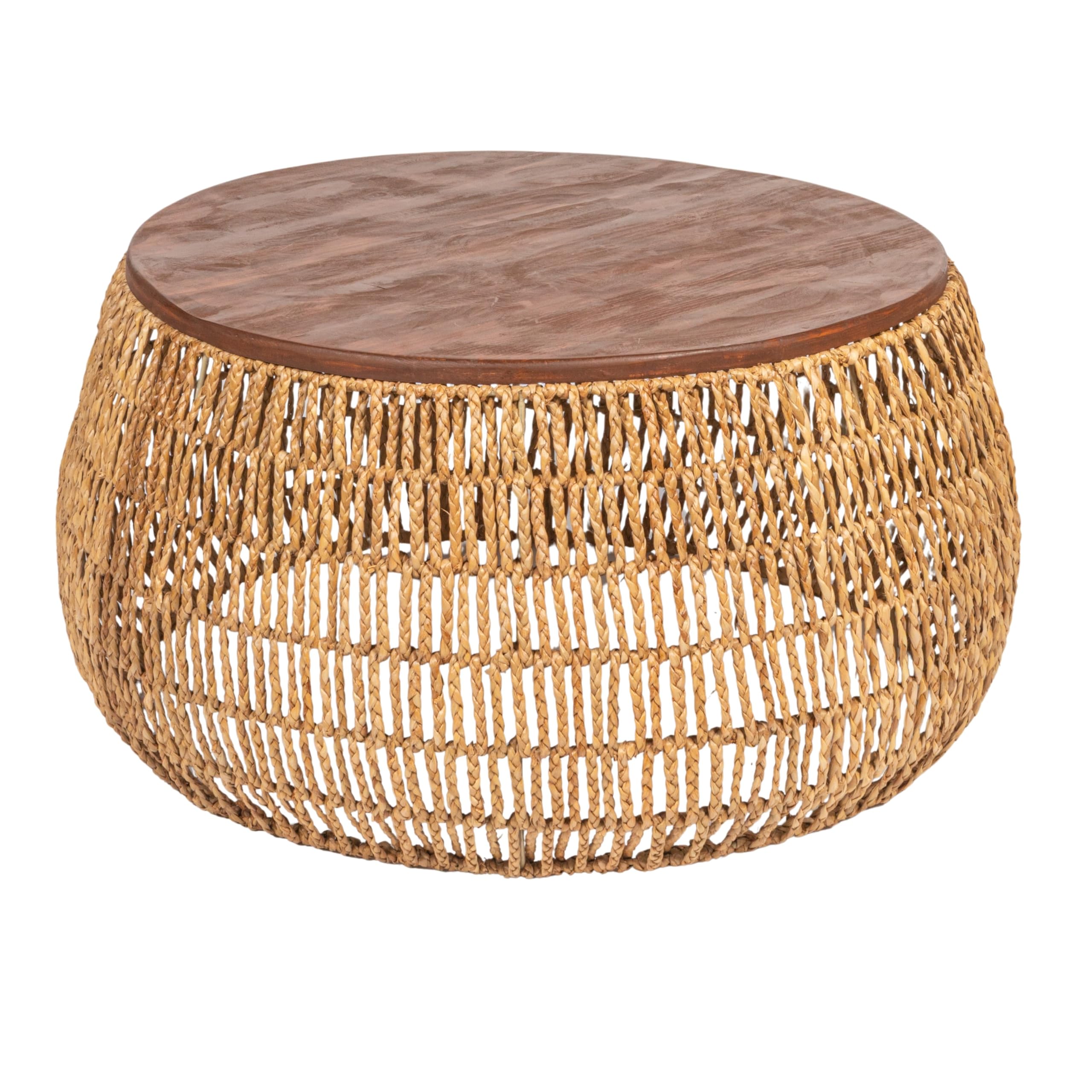 This round coffee table from Bloomingville combines hand-woven seagrass detailing with a reclaimed pine wood top, offering a natural, textured look suitable for diverse decor styles. Its 34-inch diameter and 17.5-inch height provide ample,