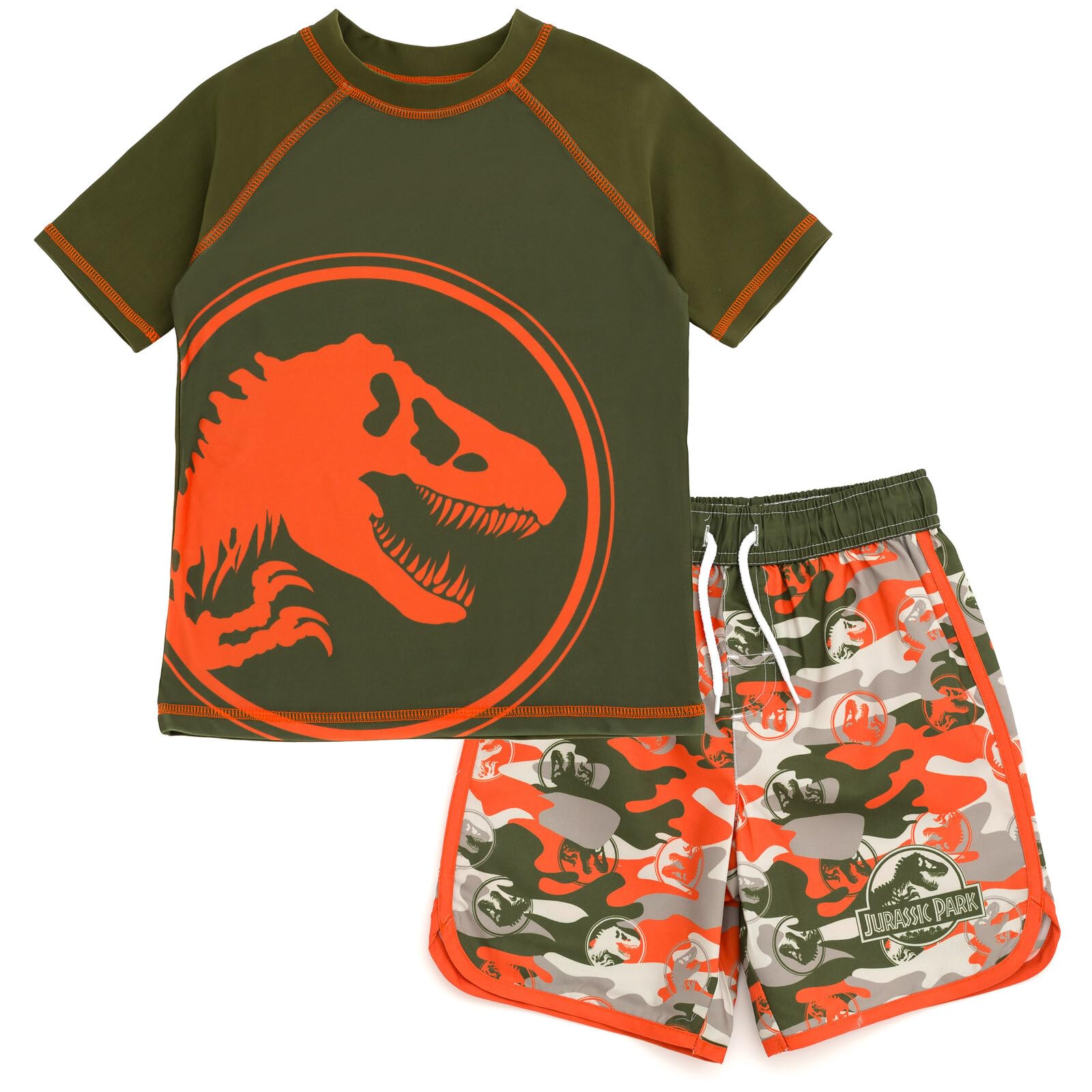 Jurassic Park T-Rex UPF 50+ Rash Guard Twill Swim Trunks Outfit Set Toddler