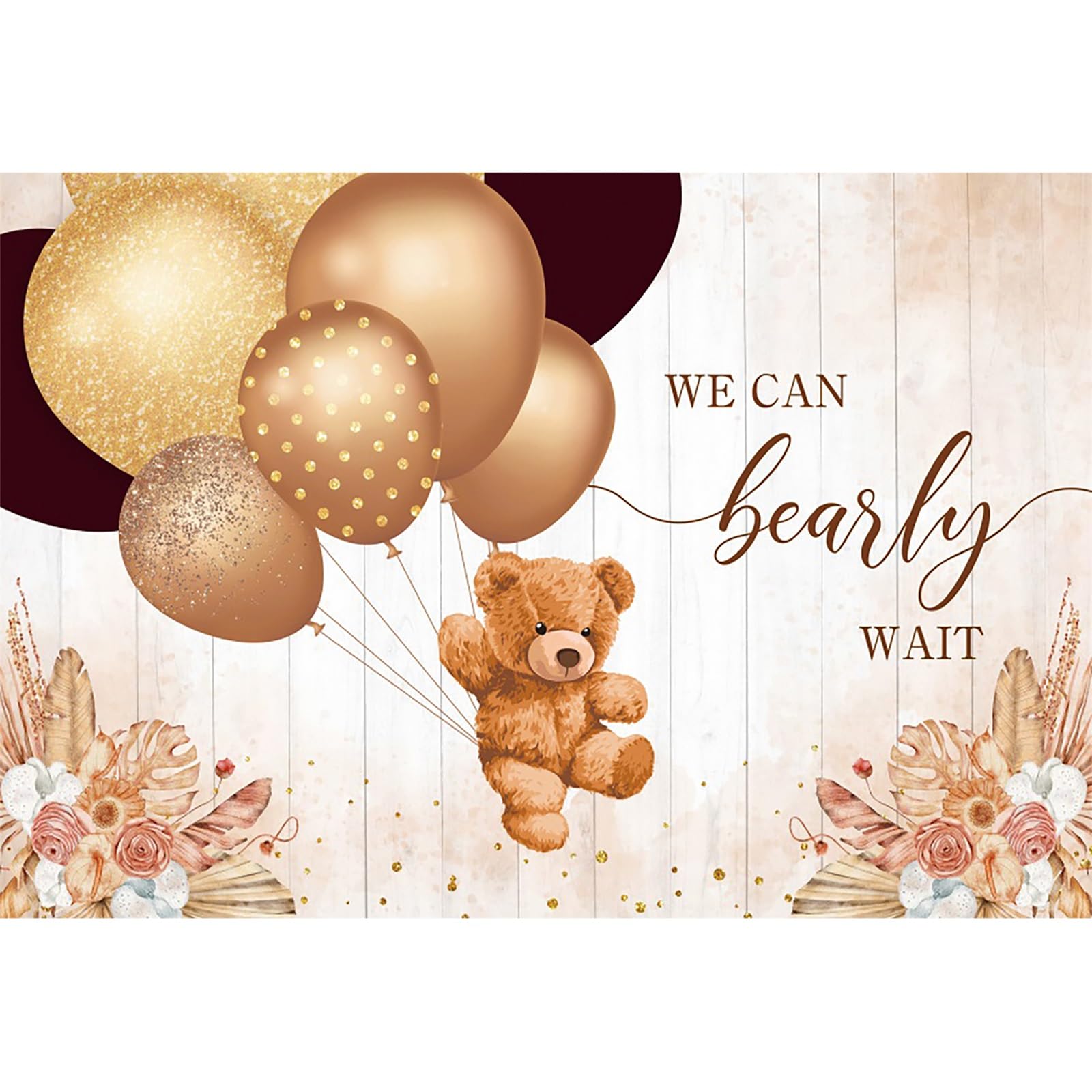 This 10x8ft vinyl backdrop features a brown bear design with cartoon balloons and the phrase 'We Can Bearly Wait,' ideal for baby showers or newborn photo shoots. It offers a large size for event decoration or photography, with a light and
