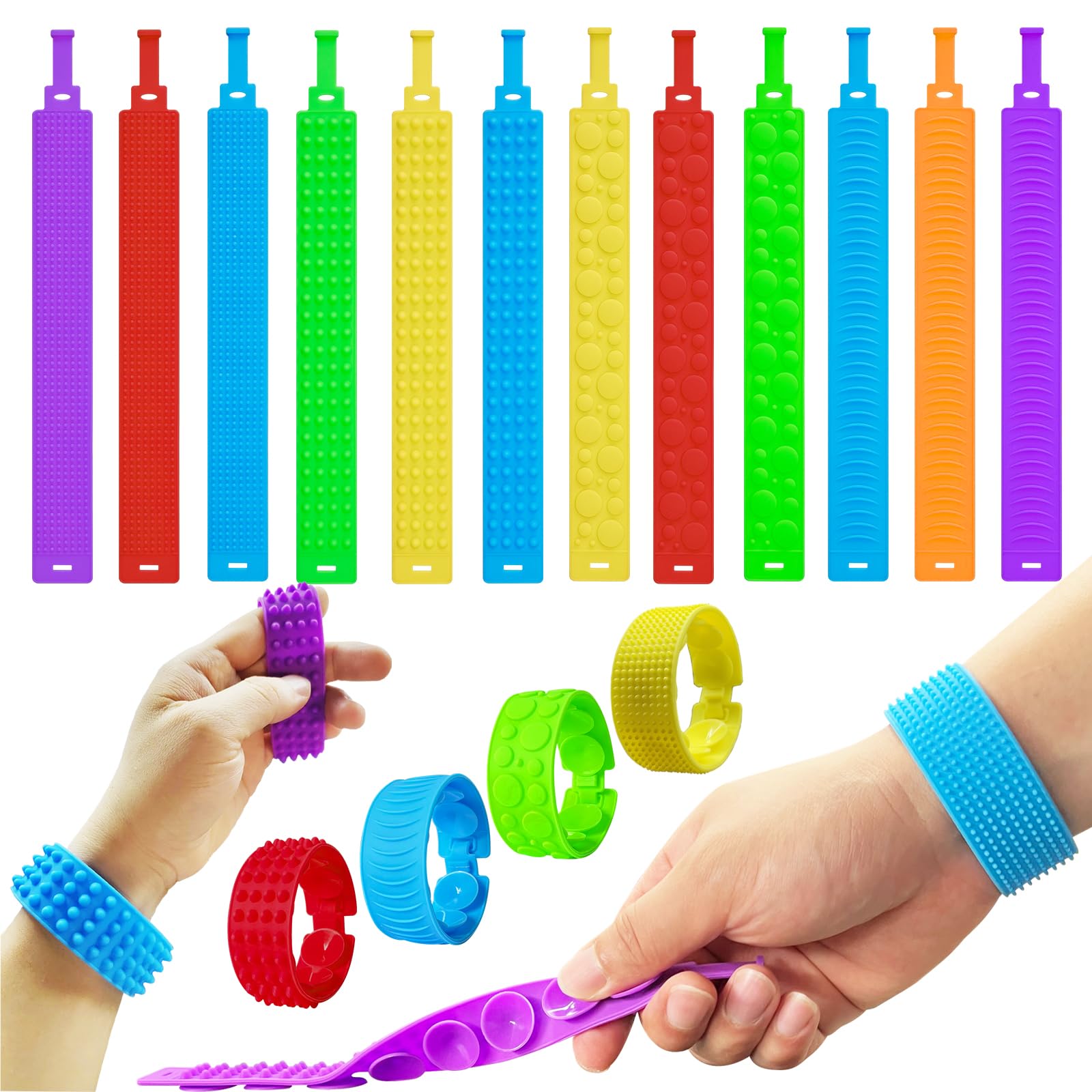 This 12-piece set of colorful silicone fidget bracelets offers a tactile way to support sensory needs for kids and adults, including those with autism or anxiety. Each bracelet measures about 8.85 inches and can be worn or used as a calming