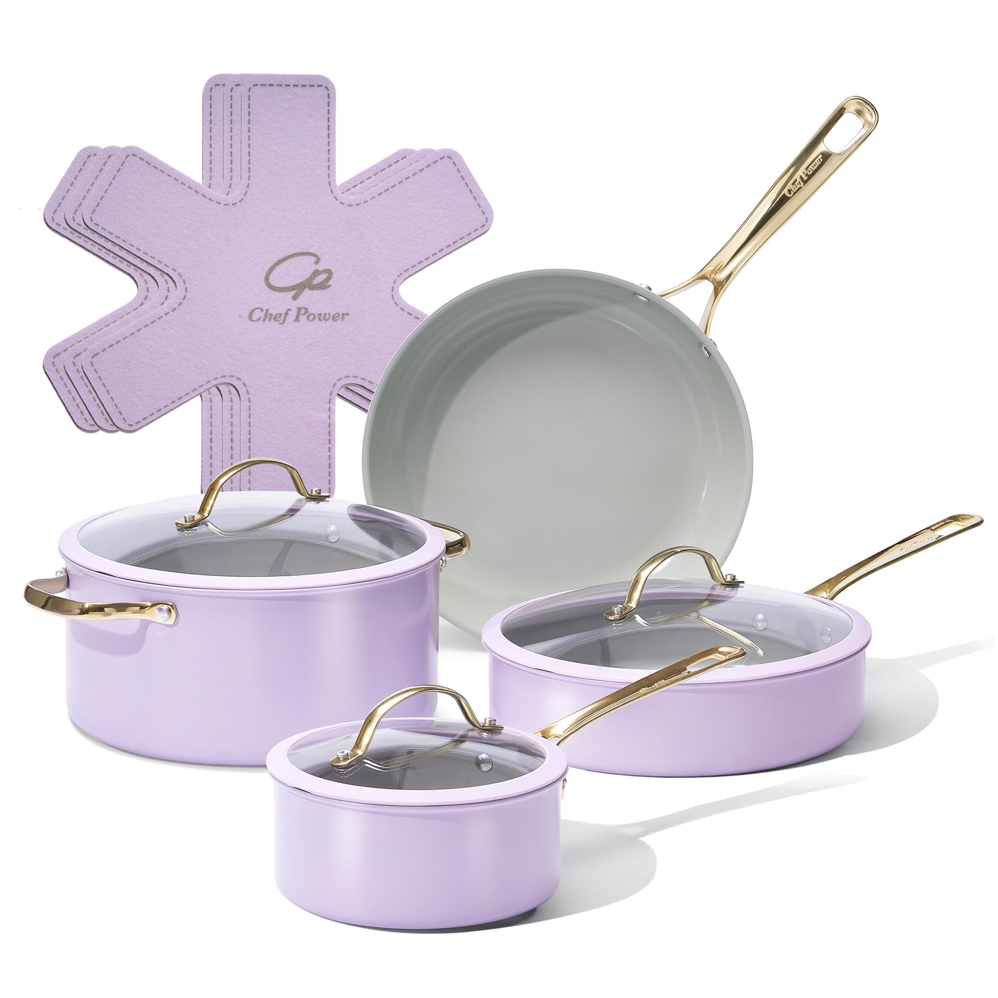 This 10-piece ceramic cookware set from Chef Power offers a stylish light purple and granite grey finish combined with practical features like stainless steel handles and glass lids with silicone vents. It's designed for easy cleaning and a