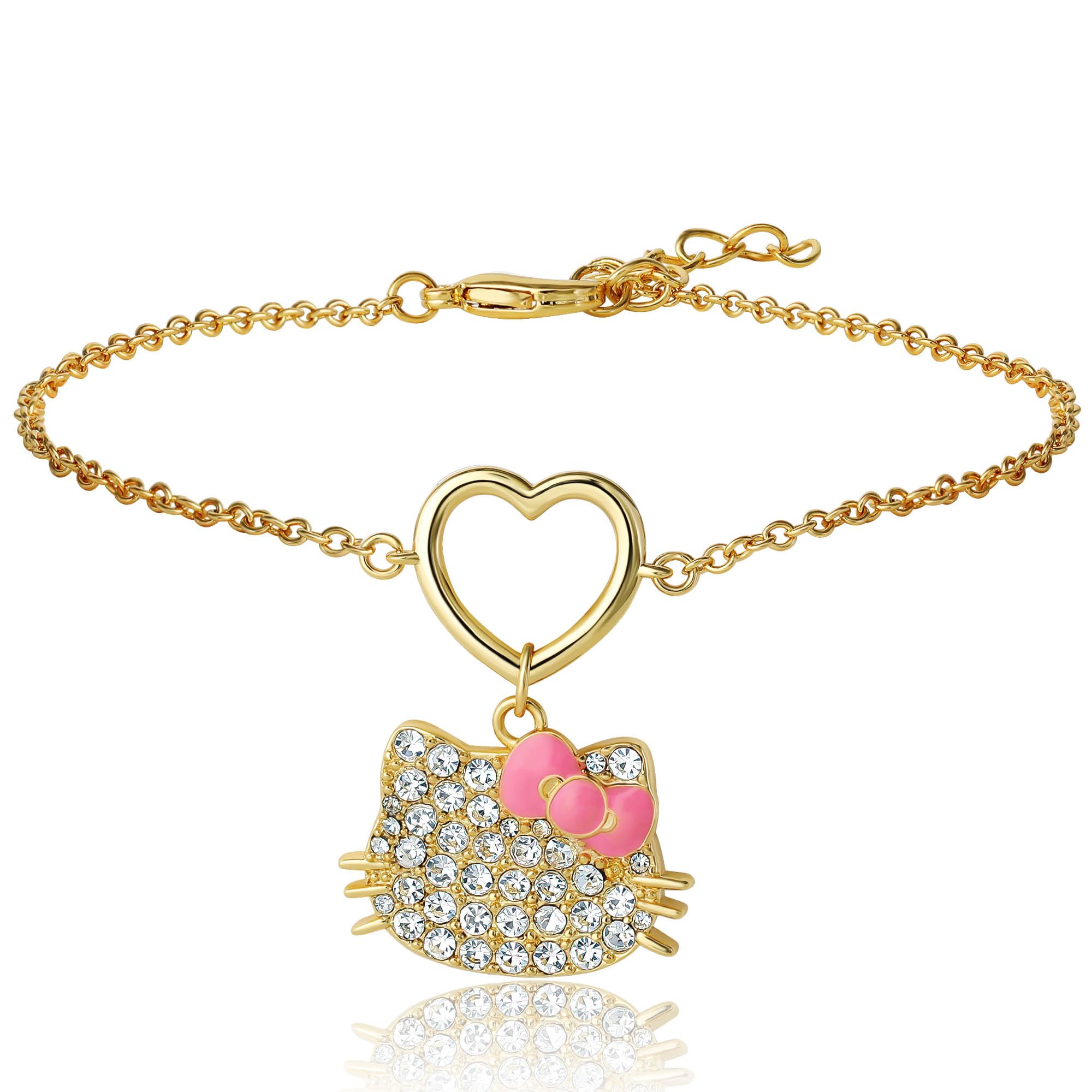SALLY ROSE Hello Kitty Pave Crystal Charm Bracelet for Women, 6.75"+1" 18k Gold Flash-Plated Official License Hello Kitty Bracelet