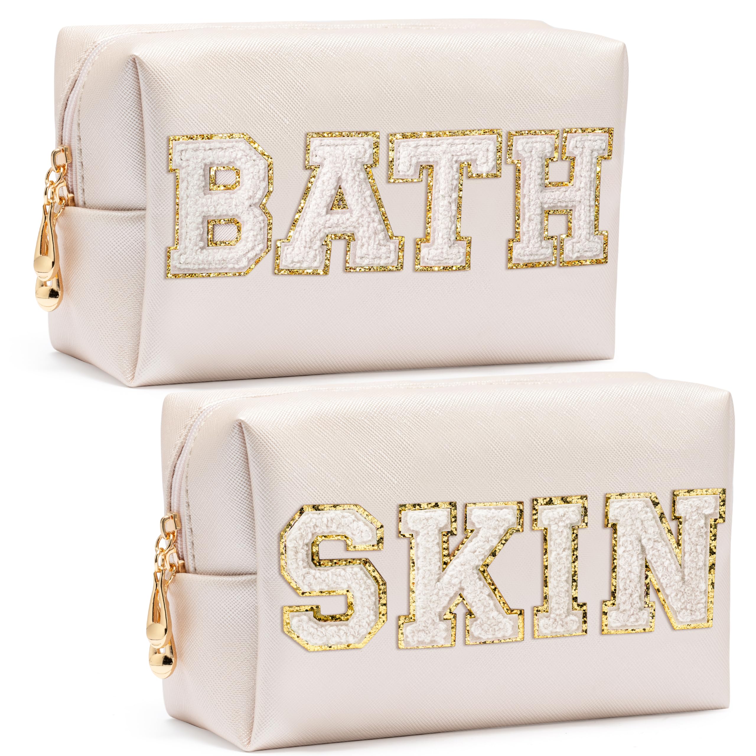CY2SIDE SKIN Letter Makeup Bag - 2PCS SKIN and BATH Chenille Letter Patch Cosmetic Bag Preppy PU Leather Patch Pouch Waterproof Portable Zipper Travel Organizer Case Christmas Gifts for Women Girls