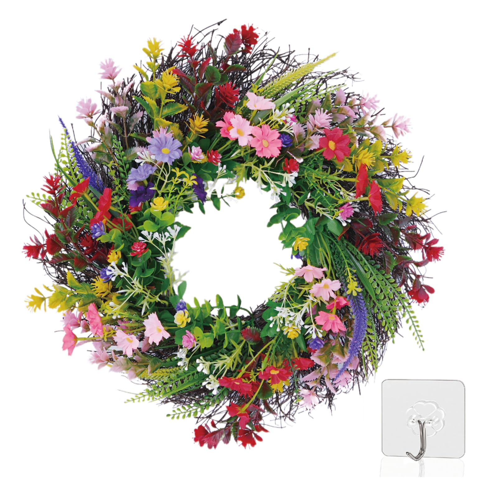 This 18-inch artificial wreath combines daisies and lavender in a vibrant spring and summer design, perfect for adding a touch of floral beauty to your front door or interior walls. Made from durable plastic rattan, it offers a maintenance-