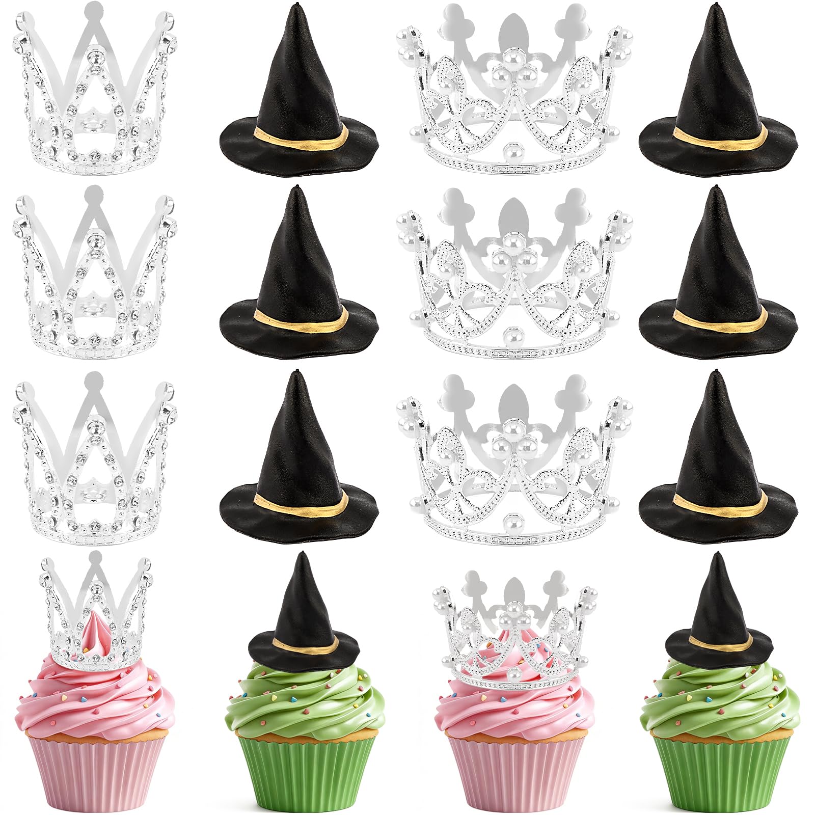 This set includes 12 mini cake toppers featuring 6 witch hats and 6 crowns, crafted from metal and plastic. They are designed to decorate cakes and cupcakes with a whimsical theme suitable for birthdays, Halloween, or princess parties. The