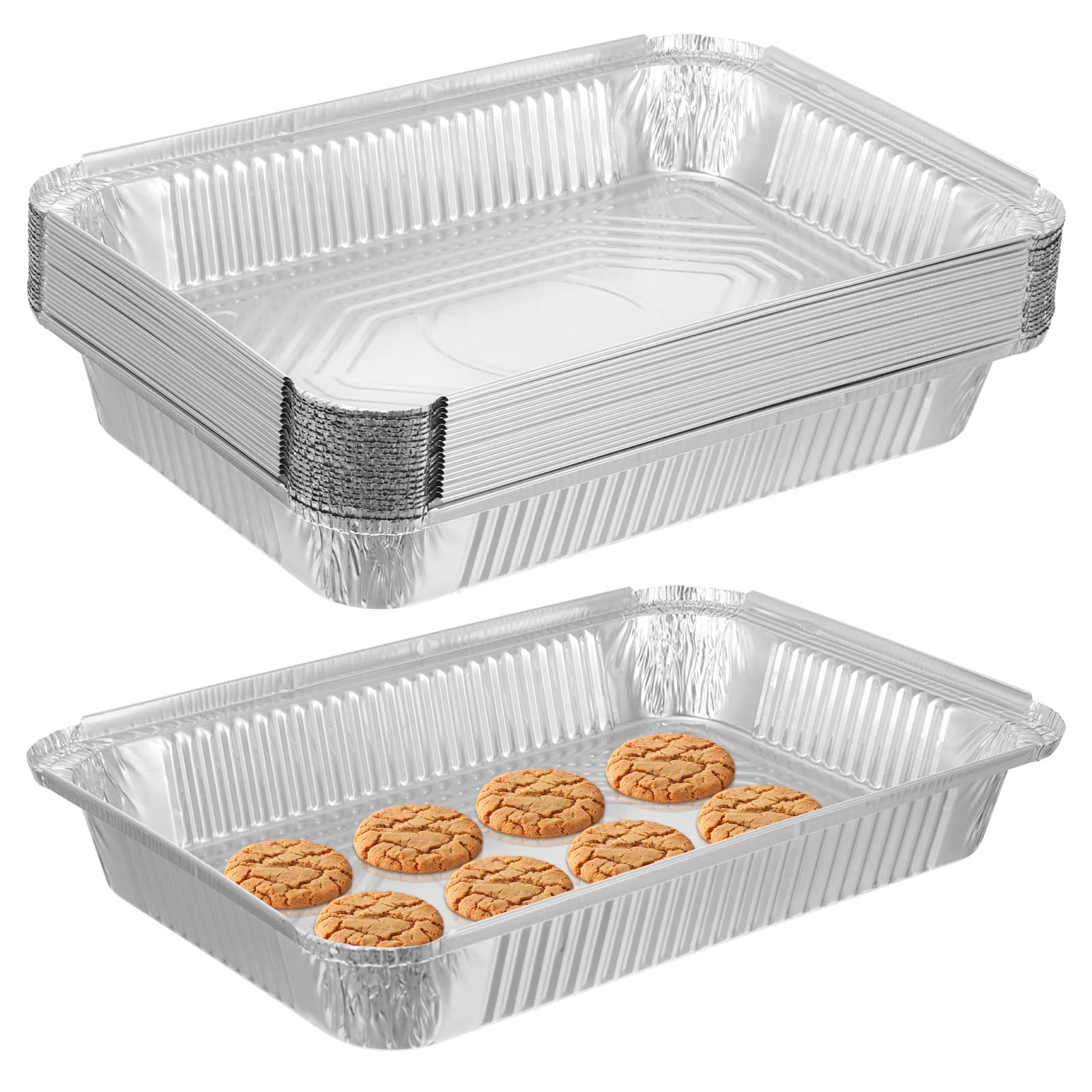 This 20-pack of disposable aluminum pans measures 12.4 by 8.5 inches, offering a practical solution for baking and cooking tasks that require easy cleanup. Made from food-grade aluminum, these pans conduct heat evenly and suit a variety of