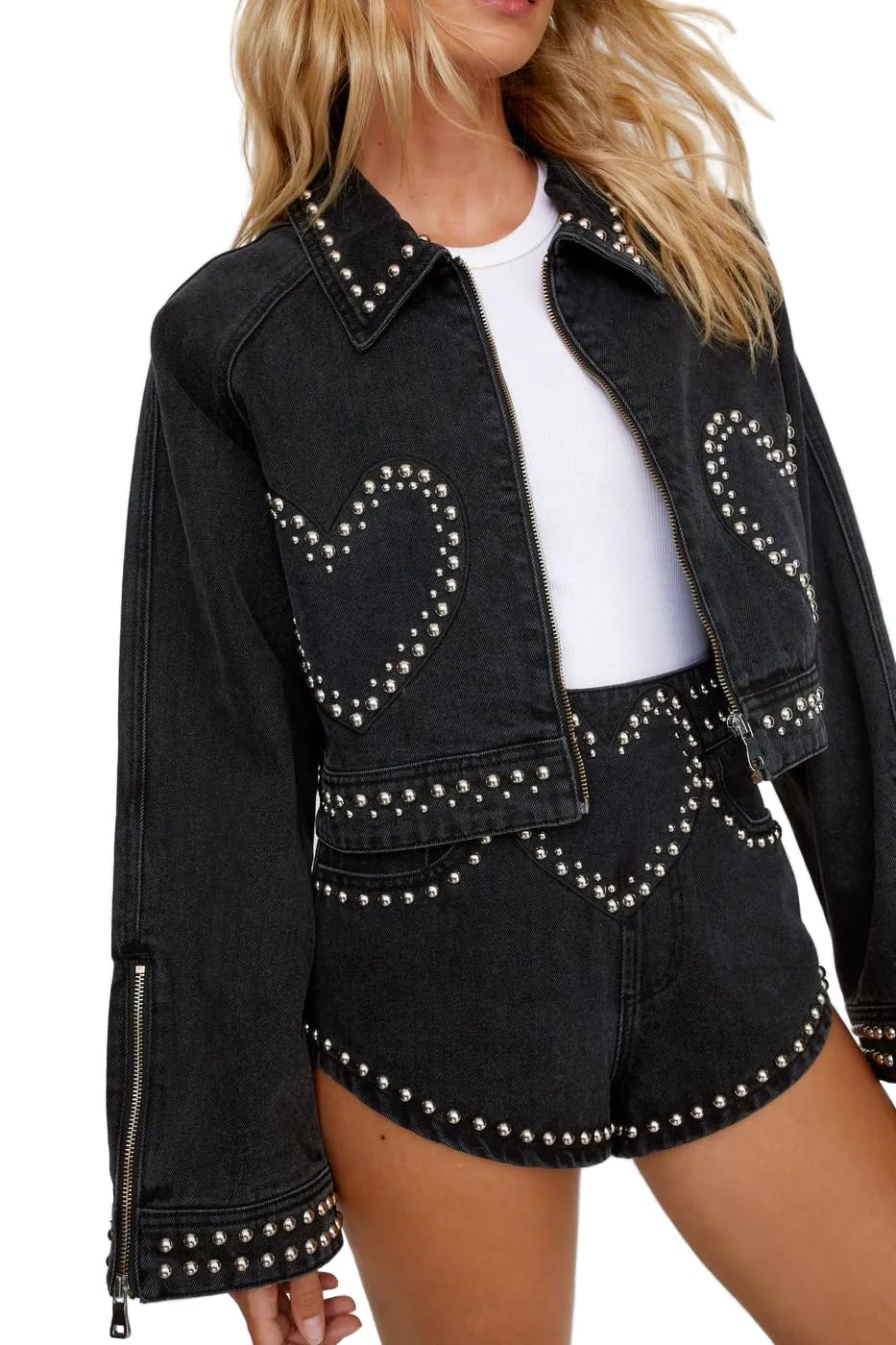 This cropped denim jacket from Nasty Gal features heart-shaped studs that add a unique blend of playful and bold style. Its fitted cut enhances silhouette and offers a trendy look suitable for casual nights out or urban streetwear.