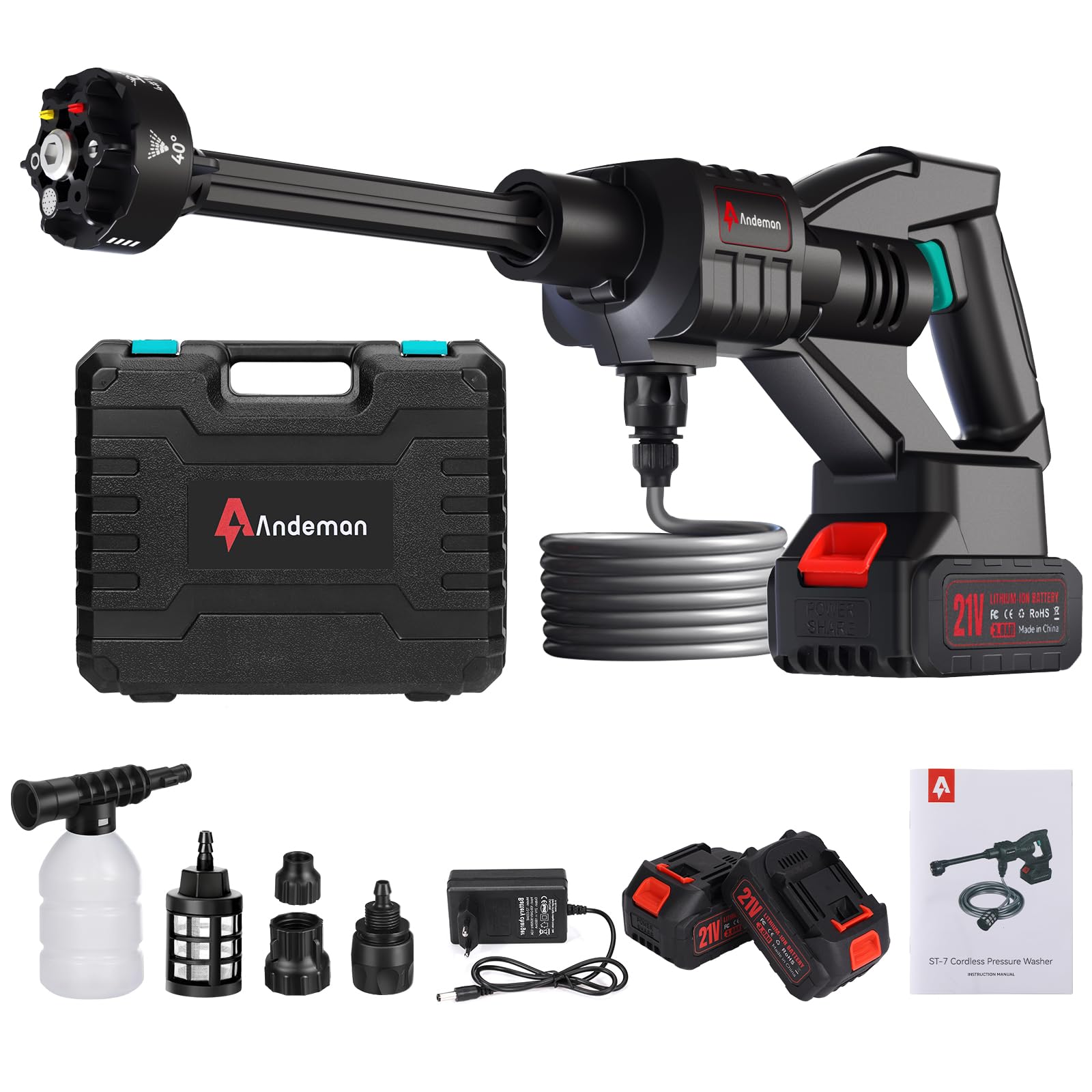 This cordless pressure washer offers 800 PSI of pressure and a flow rate of 1.5 gallons per minute, making it a lightweight and portable tool for cleaning cars, patios, driveways, fences, and other outdoor surfaces. It includes two 3.0Ah b