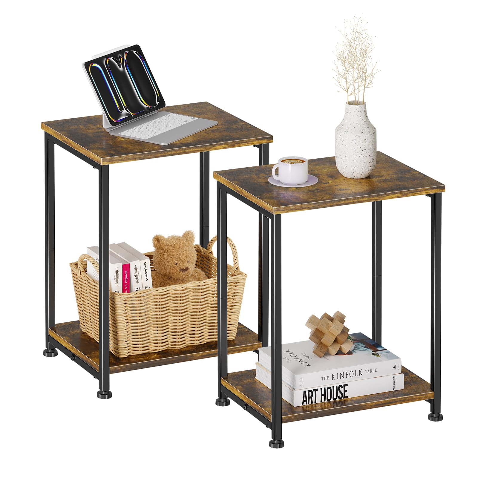 This set of two rustic brown end tables offers a practical and stylish solution for living rooms or bedrooms needing extra surface and storage space. Each table features two tiers to help organize essentials while fitting comfortably in coz