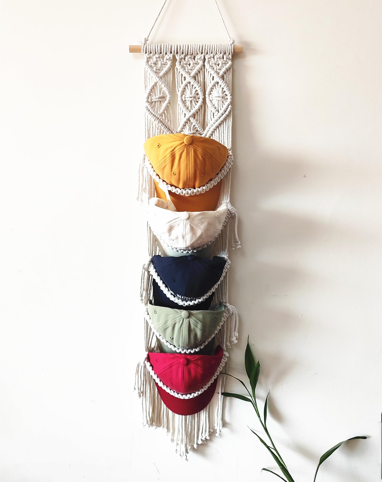 RUIZHIXUAN Macrame Cap Holder, Boho Hats organizer for baseball Caps, Hat Rack for Wall Hanging Decoration, Cap Rack for collection Display, Handmade Cap Hanger Storage Organizer (Five hats)