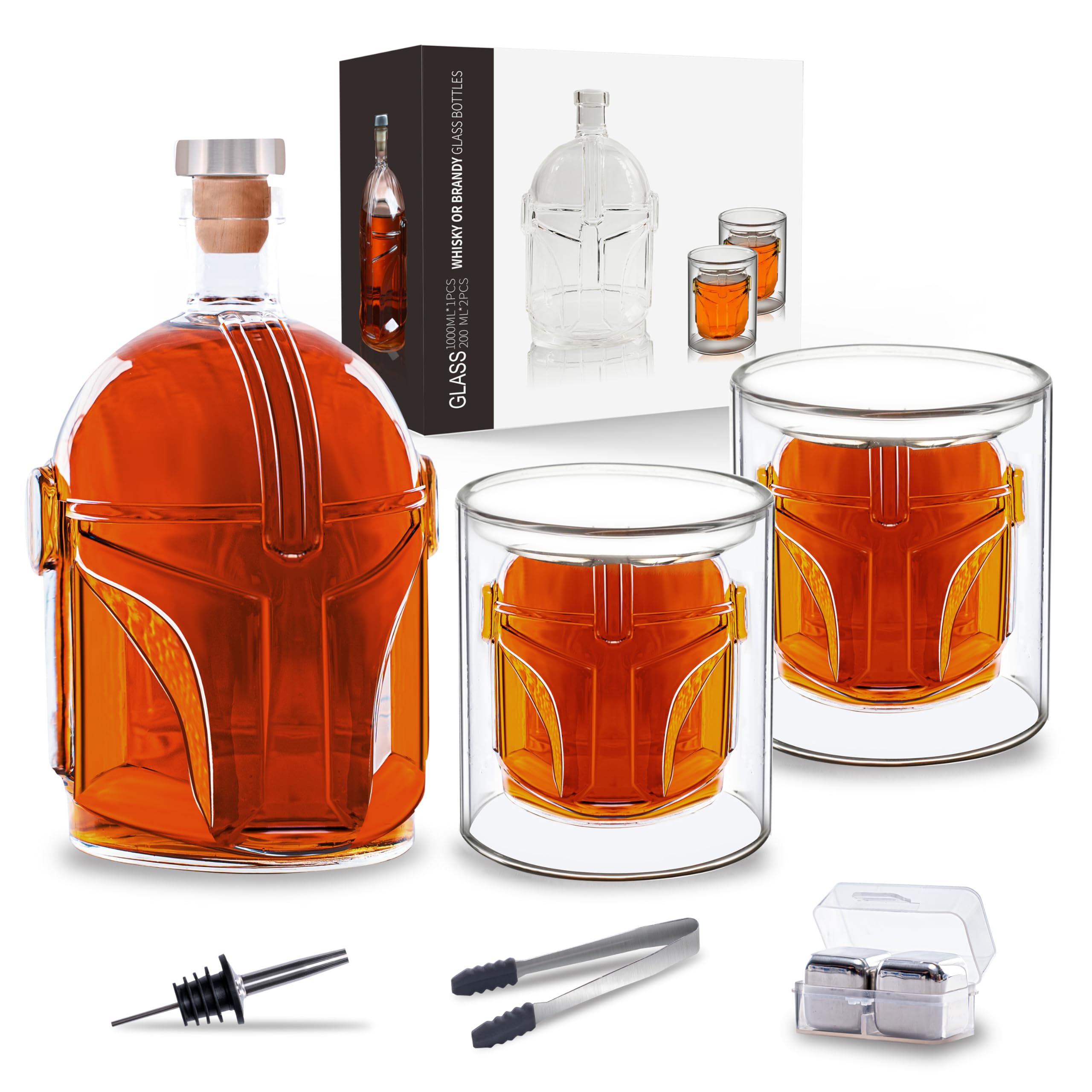 This set features a 1000ml glass decanter shaped like a space helmet, accompanied by two glasses and whiskey stones, making it a distinctive way to serve bourbon or scotch. Crafted from lead-free glass with hand-blown detail, it combines a趣