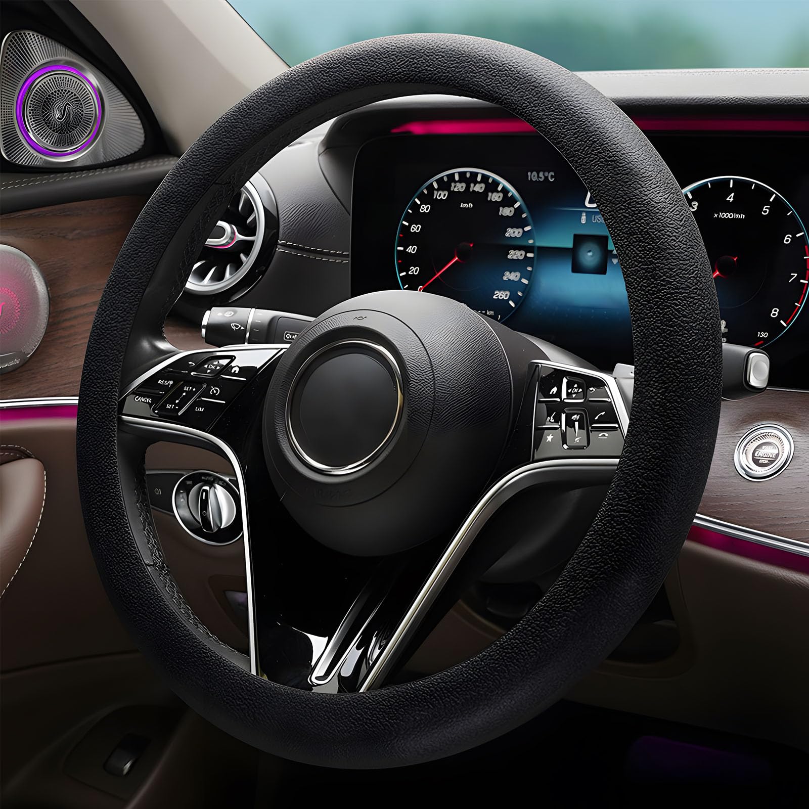 This black silicone steering wheel cover fits most 15-inch wheels and offers a soft, stretchy grip to enhance driving comfort. It's designed to be easy to install and provides a subtle upgrade to your vehicle's interior at a low price point