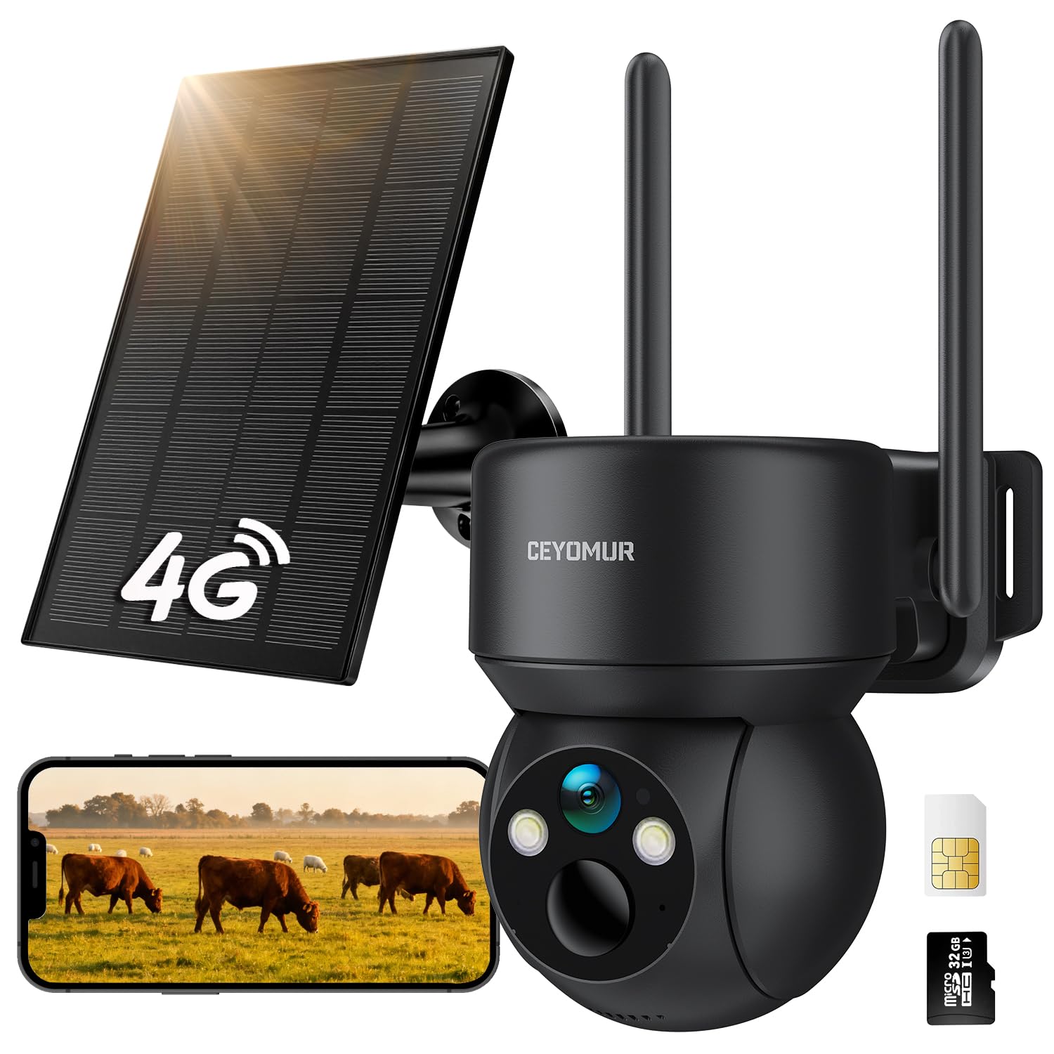 CEYOMUR Trail Camera, 4G LTE Cellular Security Camera with Built-in SIM & 32GB TF Card, Outdoor Security Camera with 2K Color Night Vision, 360° PTZ View, 2-Way Audio, IP66, No WiFi Needed