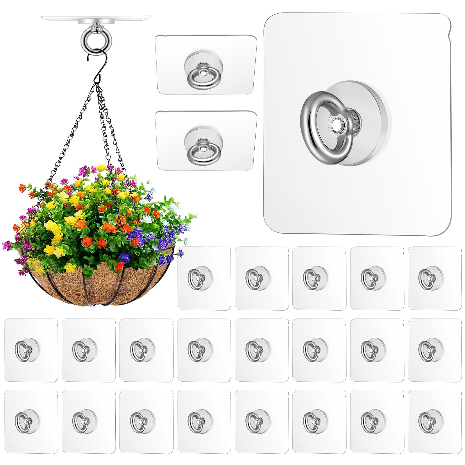 This 24-piece set of adhesive ceiling hooks from Yuanan offers a practical solution for hanging plants, decorations, or ornaments without drilling. Made of stainless steel with a transparent and silver finish, each hook includes a 360° rot-