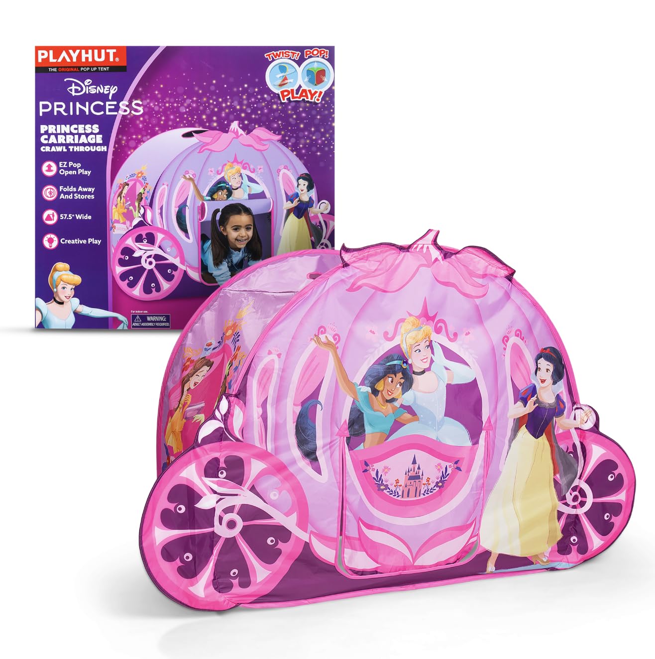 This Playhut Disney Princess Carriage Crawl Through tent offers a playful, portable space for children to immerse themselves in imaginative adventures featuring favorite Disney princesses. Its crawl-through design and vibrant graphics turn