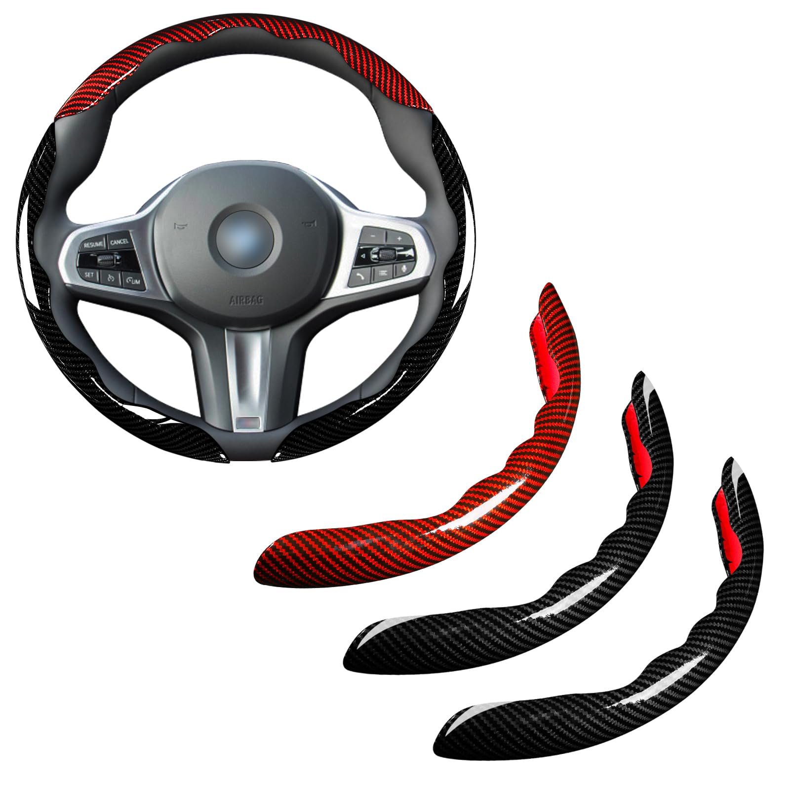 Car Steering Wheel Cover Set Bright Carbon Fiber Wrap Non-Slip 3pcs Steering Wheel Accessories 14.5-15 inch Universal (Red Black)