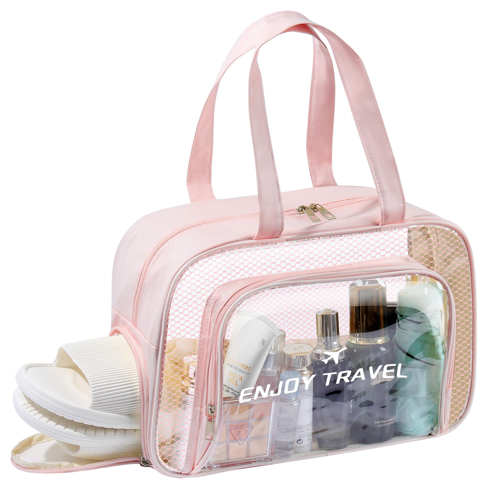 Make your travel organization effortless with this stylish pink clear toiletry bag from BuyCard. Perfect for keeping your essentials visible and accessible, this versatile bag features a dedicated shoes compartment and multiple sections for efficient storage of all your travel necessities. The transparent PVC construction lets you quickly locate items while meeting carry-on requirements at security checkpoints. With its sturdy handles and reliable zipper closure, this waterproof toiletry organizer combines practicality with convenience. The spacious design accommodates full-size toiletries, makeup, and accessories, while the separate compartments prevent spills and keep items neatly arranged. Whether you're jet-setting across continents or heading to the gym, this durable cosmetic tote ensures your personal care items stay organized and protected. The classic pink trim adds a touch of elegance to the practical clear design, making it a must-have travel companion for any journey.